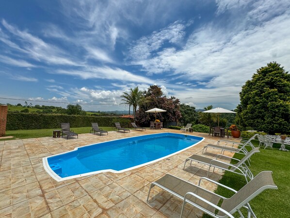 Yes, this property has an outdoor pool. Pool access is from 7:00 AM to 10:00 PM.