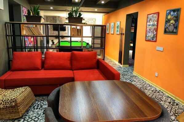 Travelers can dive into entertainment at this Guichi District retreat where arcade games, pool tables, and secure luggage storage await
