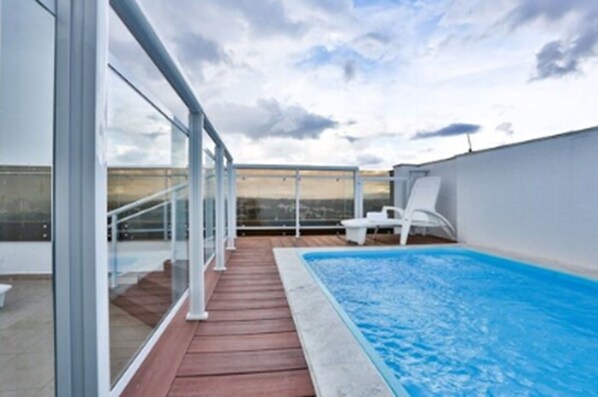 Travelers enjoy the vibrant atmosphere of the rooftop terrace at this Alvorada hotel, where a well-equipped gym helps them stay energized during their stay