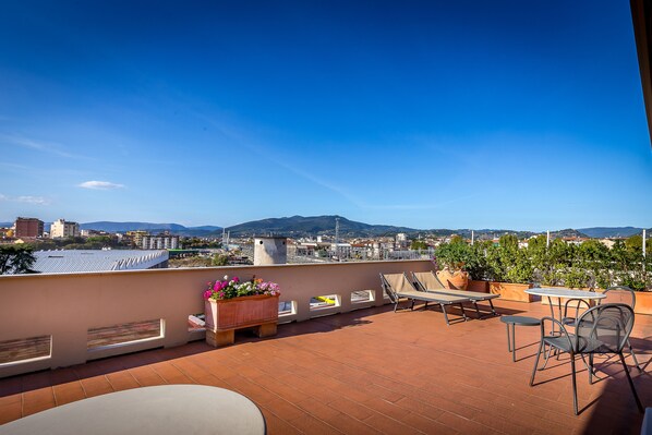 Travelers enjoy a delicious breakfast before heading to the rooftop terrace with Florence's views, while express check-in and multilingual staff enhance the stay.
