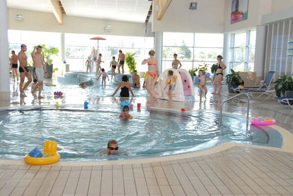 Buly Aréna Kravaře welcomes families with both indoor and outdoor pools for refreshing dips. Parents can recharge in the sauna or relax on the terrace while children explore the playground or challenge each other in the arcade/game room.