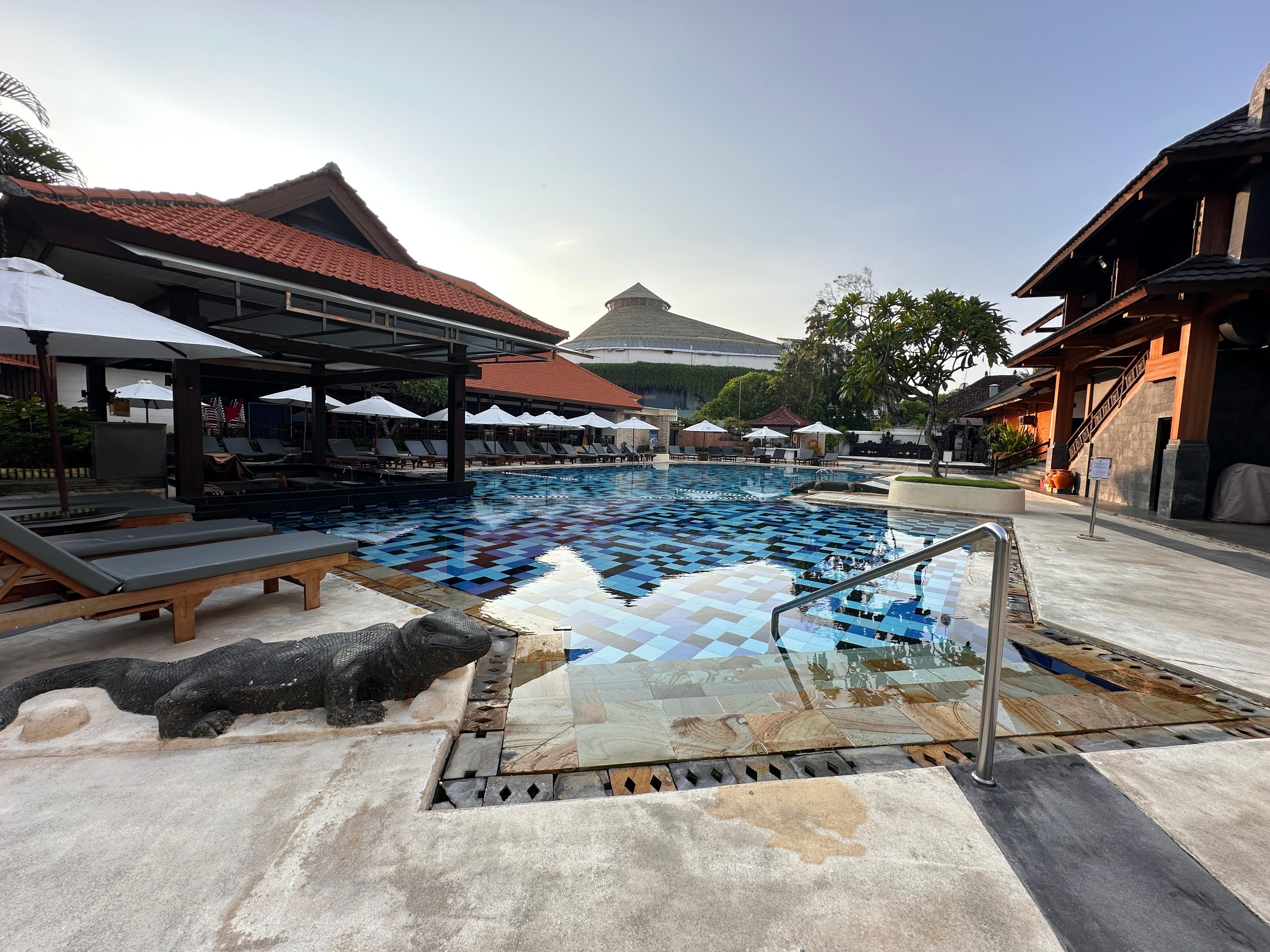 We love this hotel it’s in a great location beachfront staff are lovely good swim up pool bar great restaurant the gardens are beautiful and very well maintained ,very traditional style and really feels like your in Bali on holidays this is our 2nd time staying here