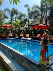 Mushroom Bay offers the peaceful retreat of Dinatah Lembongan Villas where visitors can unwind with a massage, enjoy meals at the restaurant, or spend time lounging beside either of the two outdoor swimming pools.