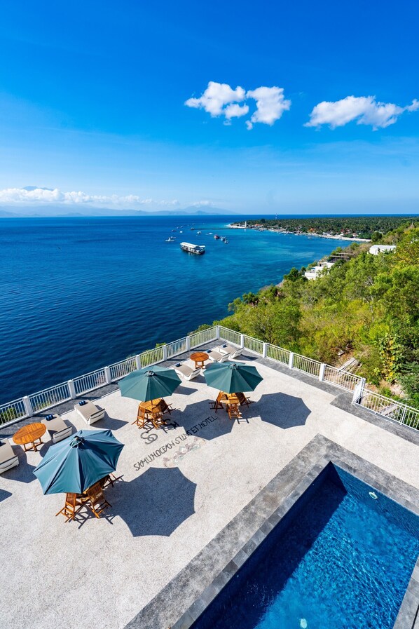 Oceanfront tranquility awaits on Nusa Penida island, where guests soak up sunshine by the pool while taking in stunning ocean panoramas