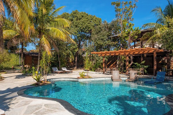 Pousada Flores do Cerrado offers a tranquil setting amid lush greenery. Guests enjoy a complimentary breakfast buffet, afternoons by the outdoor pool with sun loungers, and strolls through the garden. The on-site restaurant and bar complete this restful getaway.