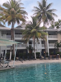 Tropical gardens and a lagoon-style pool create a serene oasis near the beach and marina. Spacious rooms with balconies, BBQs, and spa baths offer unparalleled relaxation.