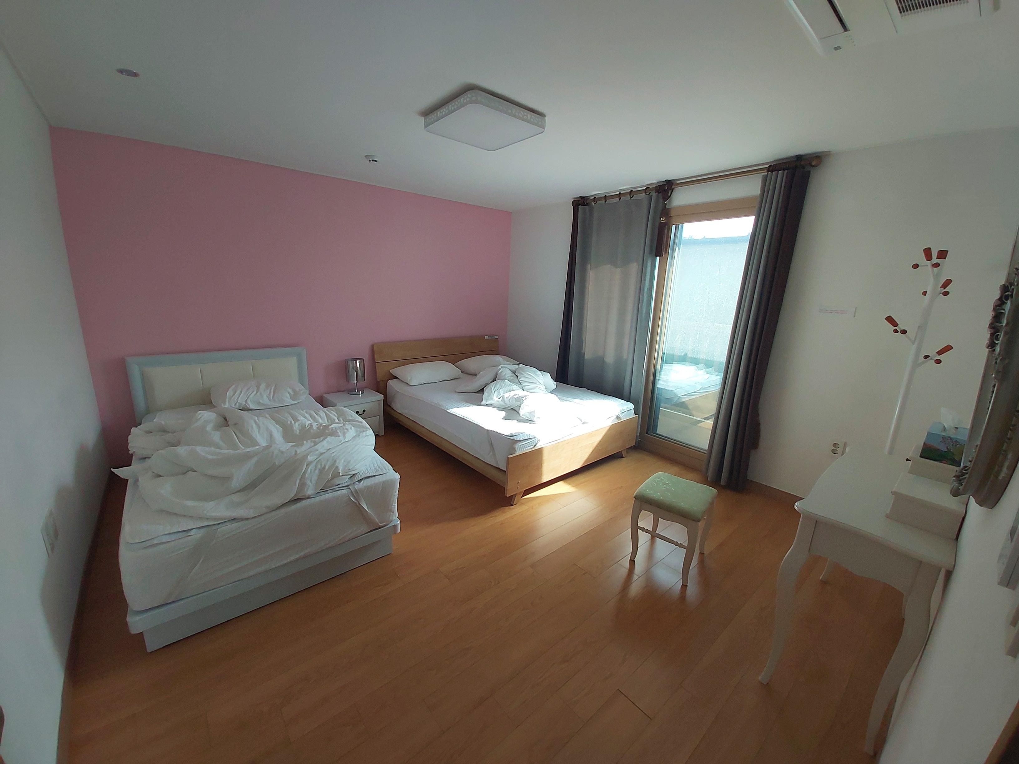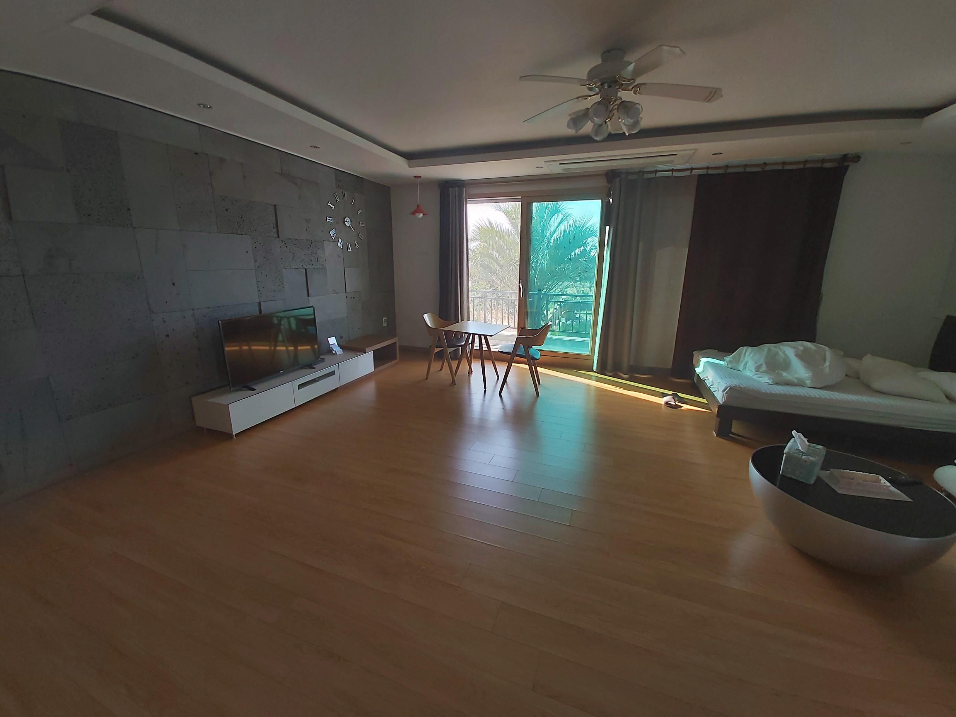 The location is quite remote: 15 minutes by car from Pyeoson beach and adjoining shops and activities. There is a small cluster of shops consisting of a 7-Eleven and 2 or 3 small restaurants about a minute's walk away. Very nice if you like the countryside.