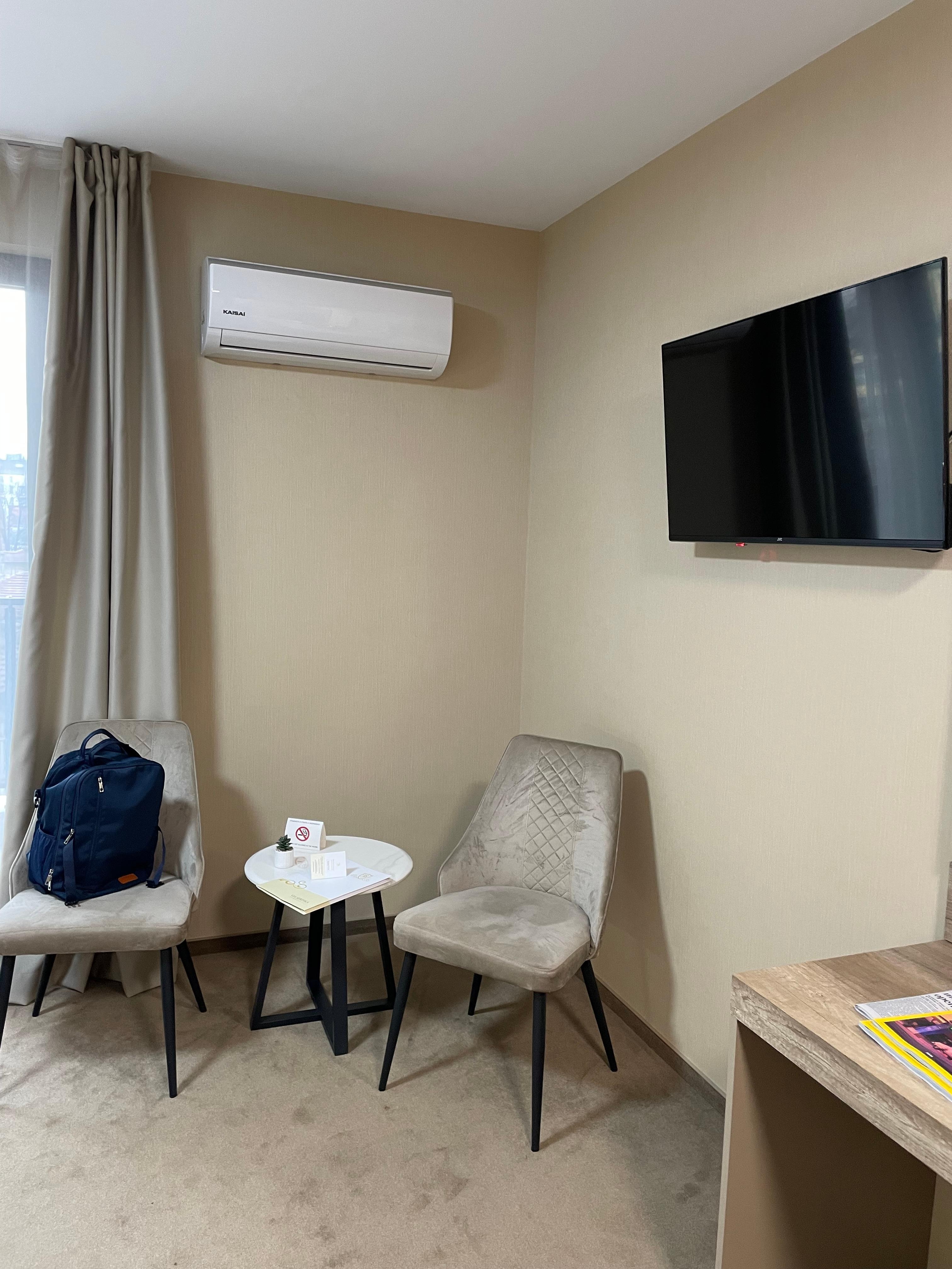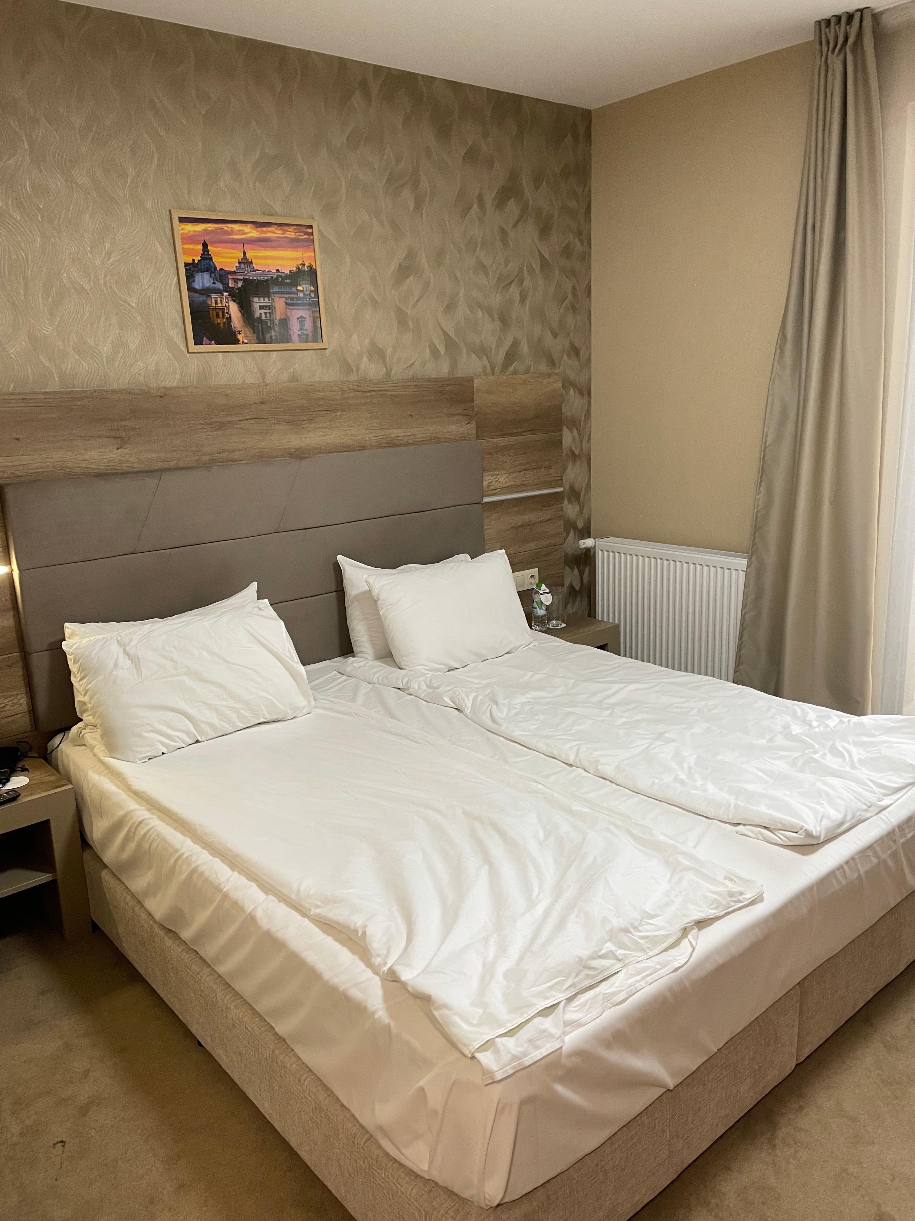 We spent 3 nights at this hotel. The room we had was extremely noisy! The location wasn’t bad if you’re a walker. Taxi drivers were generally nice. Plan on about 20 euro to get you to the hotel from the airport.The staff agreed to schedule a taxi for us at 4:15 am the day before we left and we confirmed they had done so because we had a super early flight and the gate closed early. 8 Taxis passed us but none stopped. The gentleman at reception called again and the taxi finally arrived 15 plus minutes late. The beds were okay and the air conditioning (mini split) worked well. The woman who checked us in however was absolutely humorless. Sofia is a beautiful city but if I were to return I would choose a hotel closer to the many historic buildings that are located in a relatively small area.