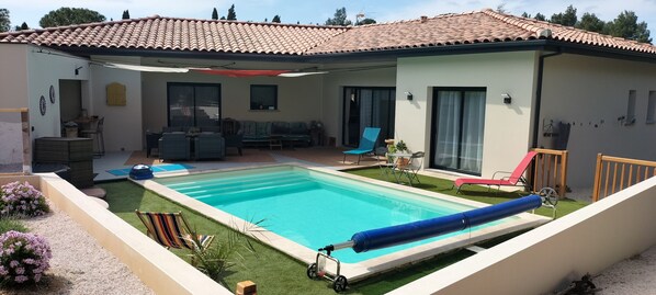 Escape to Les garrigues Ensoleillées, where serene moments await. Begin your day with a full breakfast, then unwind at the Jaccuzi spa or lounge by the seasonal outdoor pool surrounded by lush gardens and an outdoor entertainment area.