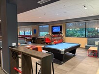 Travelers can recharge with complimentary coffee in the welcoming lobby before challenging friends to a game of billiards or enjoying the nearby arcade room