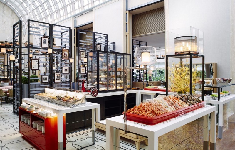 Shangri-La Singapore’s restaurant is named “The Line” to symbolise continuity in nature, family, culture and life. This hotel buffet can be easily distinguished from others for being one of the longest in the city state. The 16 elongated theater kitchens include cuisines such as Japanese, Local, Western, Chinese, Indian, Italian and Mediterranean. The Line’s carving station presents 6 types of roast meats to choose from. This includes 48-hour slow roasted wagyu beef leg with a mustard crust, the Australian stockyard tomahawk steak and a 200-day grain fed Australian stockyard roasted beef striploin with truffle jus.