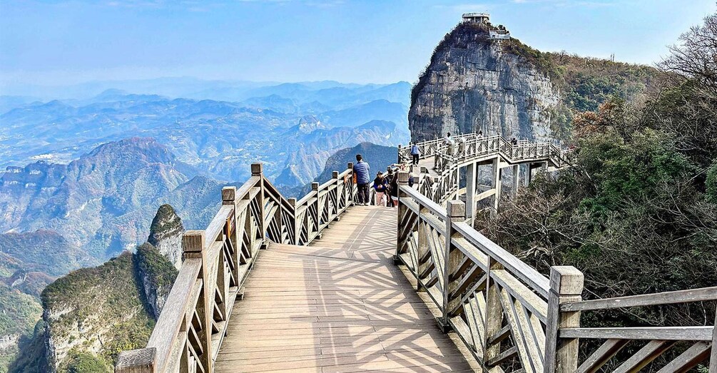 Arrive at the cableway station in our private car, and then our guide will accompany you on the Tianmen Mountain Cableway. In half an hour, we’ll reach the Air Garden at the mountaintop. Follow the guide to explore those scenic spots one by one: try the cliffside Glass Skywalk, and visit the Yuhu Peak, Wood & Stone Romance, and Tianmen Temple.