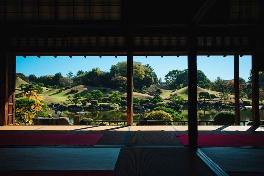 The “Kokin Denju-no-Ma” with breathtaking views of the garden/Old-fashioned souvenir shops at the park’s entrance