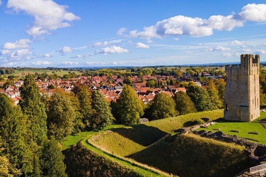 Stop in Helmsley, a charming market town renowned for its vibrant independent shops, inviting cafés, and rich history. The town’s skyline is dominated by the silhouette of Helmsley Castle, a reminder of centuries past, including scars from Oliver Cromwell’s reign.