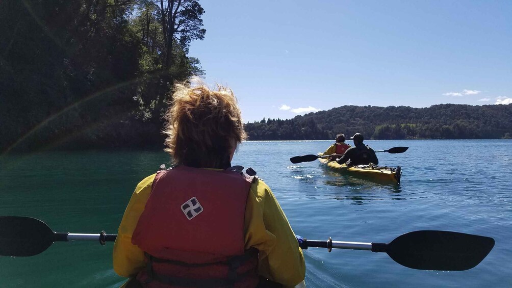 We'll get kitted out to paddle the calm and crystal-clear waters of Lake Moreno Oeste, located in the Llao Llao Municipal Park. After the guide's theoretical lesson, we'll settle into a double kayak to start paddling for two hours in these deep and serene waters that will give you a very special and unique feeling of peace. From the water, you'll see the majestic Cerro López, Cerro Bella Vista, Goye, Capilla, the imposing Cerro Tronador, and the little Cerro Llao Llao. We'll also head over to Rabbit Island and check out the famous Hotel Llao Llao from the water.