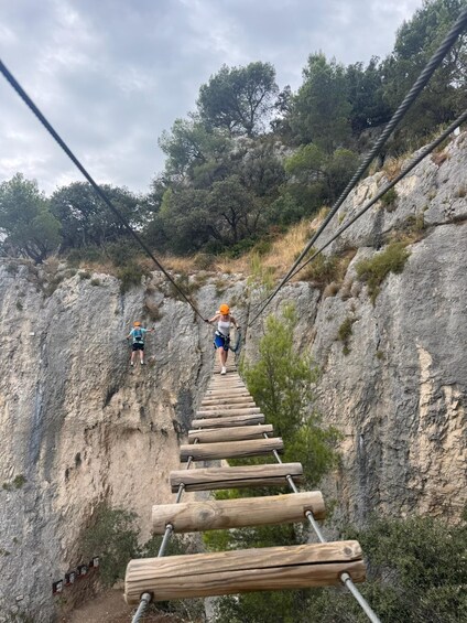 Via ferrata is an activity that mixes hiking and climbing on rock faces with cables, ladders, bridges, and other stuff attached to the rock. These facilities let you safely move along often dizzying routes, even if you're not an experienced climber.