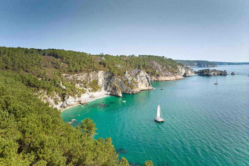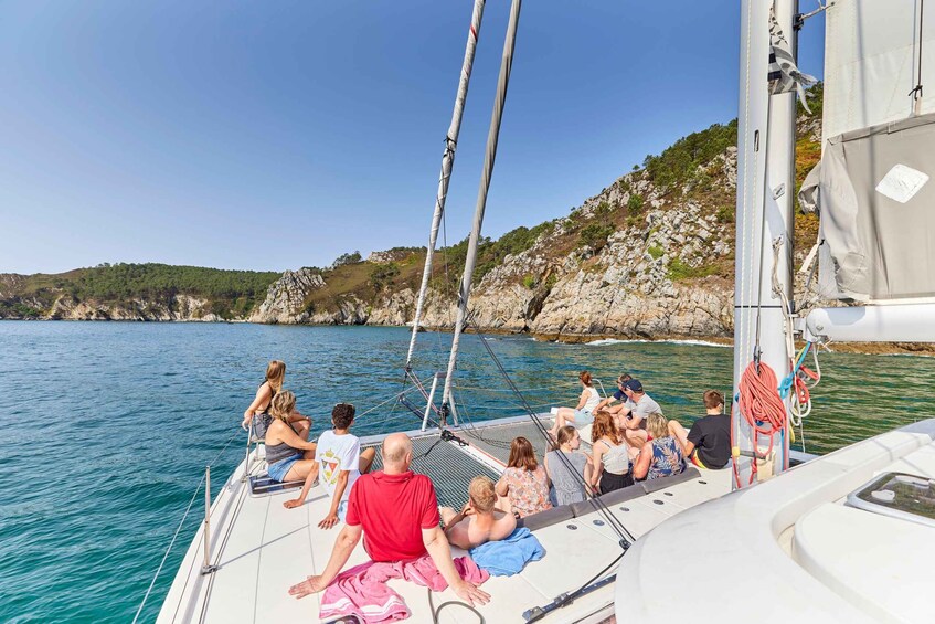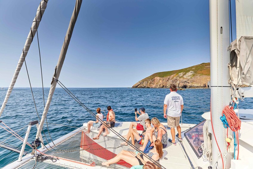 On board the catamaran Faltazi 2, you’ll discover two iconic sites on the peninsula: Île Vierge and Cap de la Chèvre, famous for their spectacular cliffs and turquoise waters.