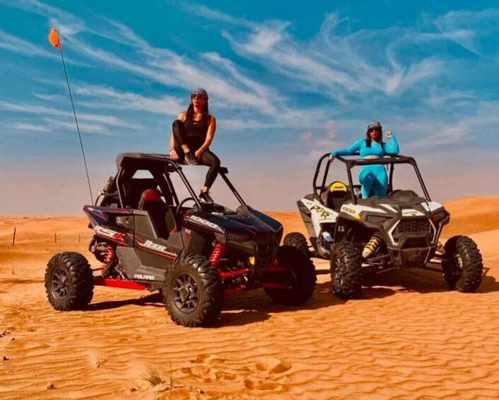 Before heading into the dunes, your driver deflates the 4x4 tyres — the sign that your dune bashing adventure is about to begin. Hold on tight as you glide over towering dunes in a powerful 4x4, with every twist offering stunning views of the desert and Arabian Gulf.