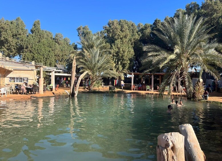 Welcome to paradise in the desert! Surrounded by golden dunes, the lush oasis of Ksar Ghilane awaits. Take your time to relax under the palm trees, swim in the warm natural spring, or opt for a camel ride (optional, extra cost) across the dunes of the Great Eastern Erg.