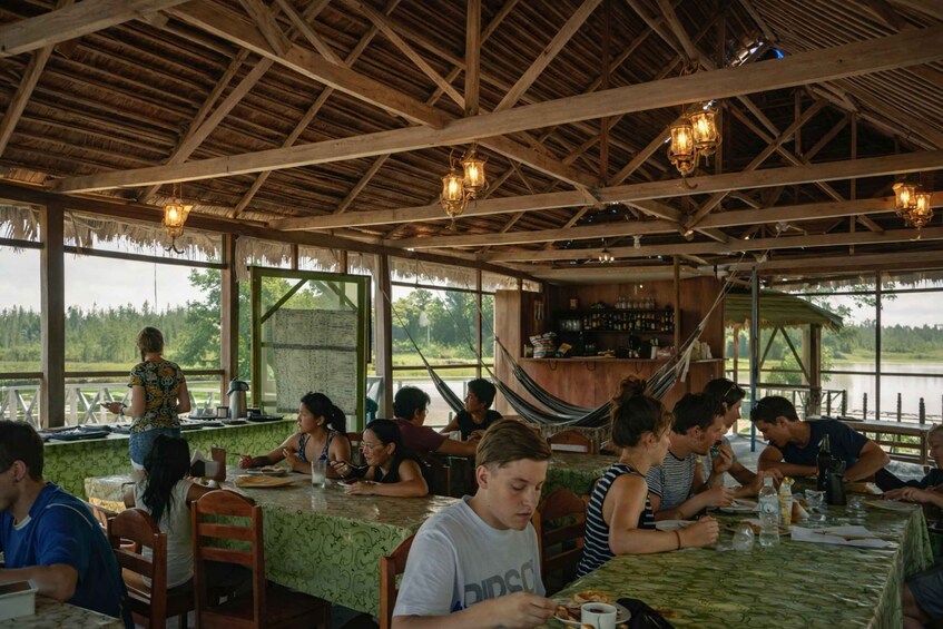 Day 2 Get up early to watch the sunrise. Spot herons, eagles, parakeets, and exotic birds. Then, return to the lodge for breakfast and free time. After lunch, fish for piranhas and more. Enjoy the sunset, followed by dinner and traditional Amazonian tales back at the lodge.