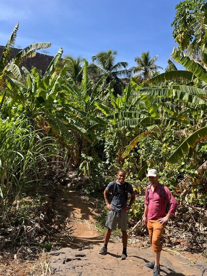Then, the guided hike begins along scenic trails that connect Calabaceira to Cidade Velha. Along the way, you will have the opportunity to enjoy breathtaking natural landscapes overlooking the ocean and the surrounding valleys, discover the diversity of the local flora, including endemic plants, hear stories about rural life and the region’s traditions, and learn about the historical context of Cape Verde’s former capital.