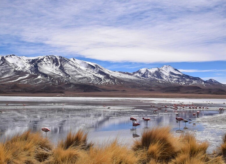 See the Lagunas de Colores, which are habitats for three species of flamingos and thousands of migratory birds. Explore one of the most important reserves of flora and fauna in the Bolivian Altiplano. Spend the night in the picturesque town of Villamar.