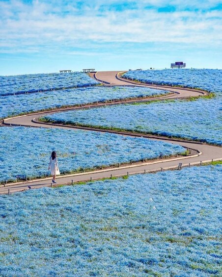 Spring (Mid-April to Early May): The legendary 4.5 million Nemophila (Baby Blue Eyes) bloom, turning the hills into a surreal “Blue Sea” that merges with the sky and ocean.