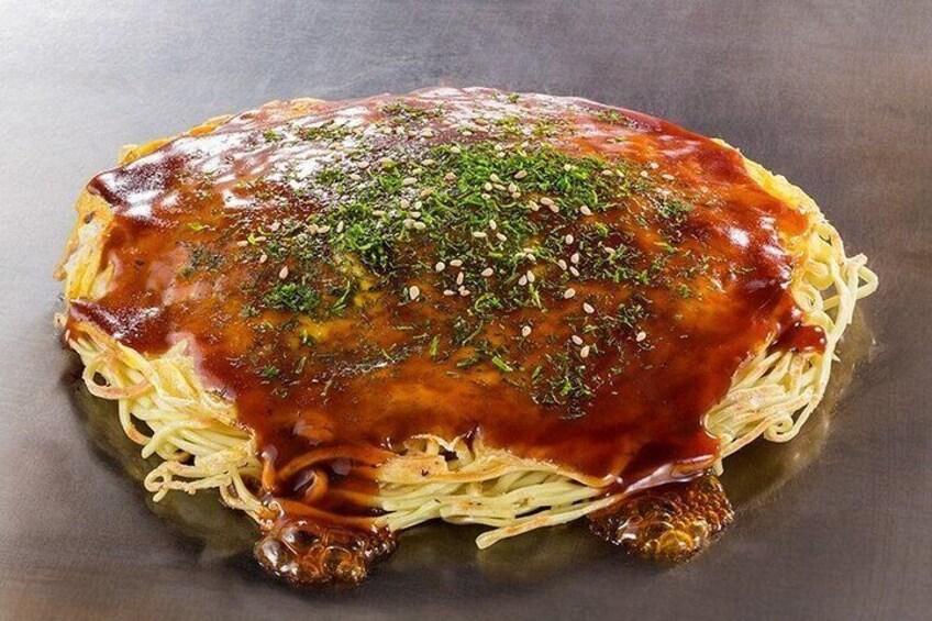 - The lunch menu is an authentic Hiroshima-style Okonomiyaki, which is topped with pork, cabbage, bean sprouts, fish powder, noodles and eggs.