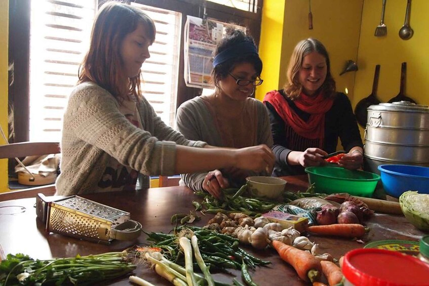 Back in the kitchen, the hands-on class begins. You will learn to cook one classic Nepali dish, choosing either momo or dal bhat, depending on your interest.