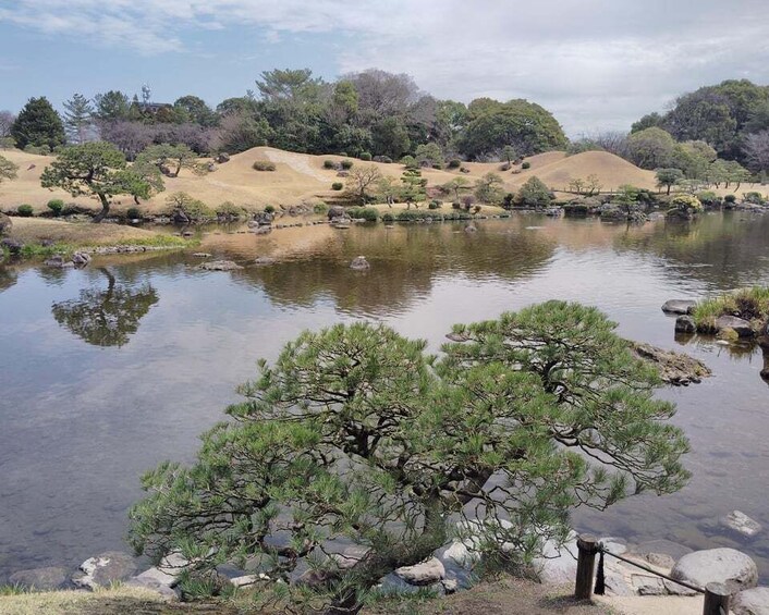 The tour also includes a visit to a historic teahouse relocated to the garden, once used by the Hosokawa family for scholarly and ceremonial purposes. Here, you’ll have the unique opportunity to enjoy matcha tea while gazing out over the beautifully maintained garden, experiencing the serenity and sophistication that once defined the life of a feudal lord.