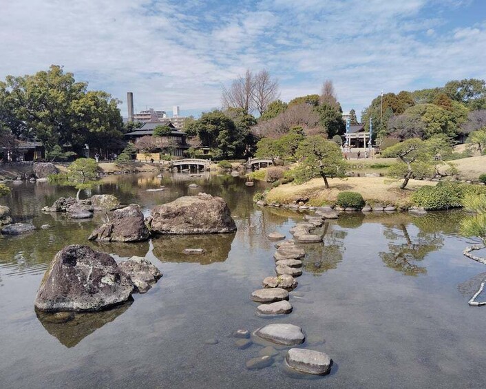 Meet your guide at the entrance to Suizenji Park, conveniently accessible by Kumamoto’s tram system, which connects the city’s key landmarks and areas. Begin a leisurely walk through the grounds, discovering the garden’s rich cultural and natural features.