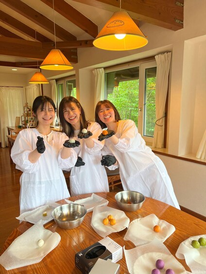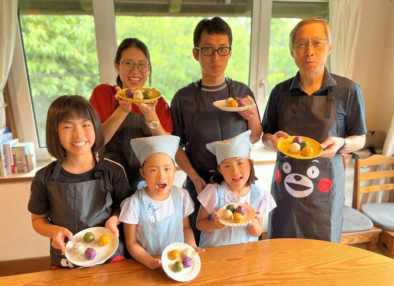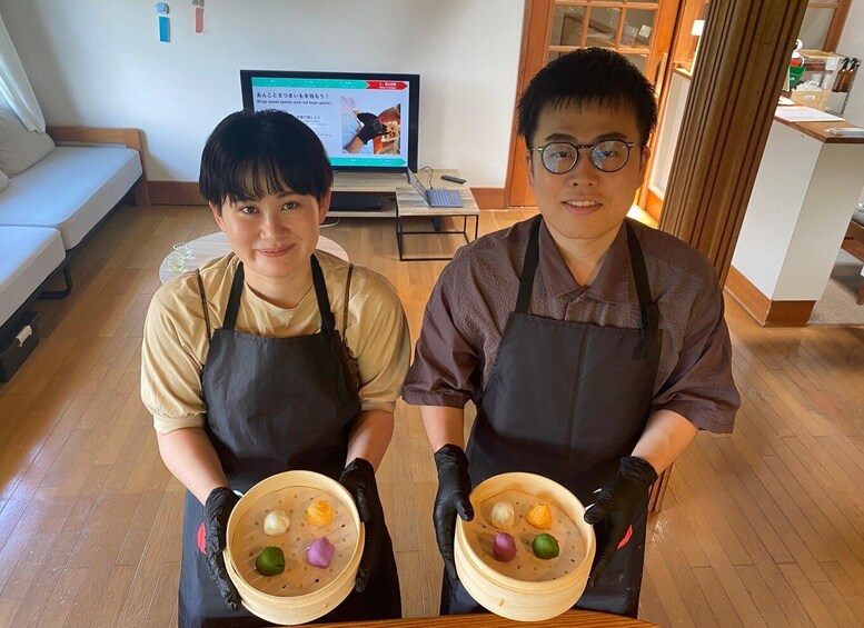 Shape the dough around sweet potatoes and your chosen filling, then steam them to perfection. While waiting, enjoy a cup of green tea from Minami Aso. Once your dango are ready, take a commemorative photo with your creations, dressed in a traditional kappogi apron.