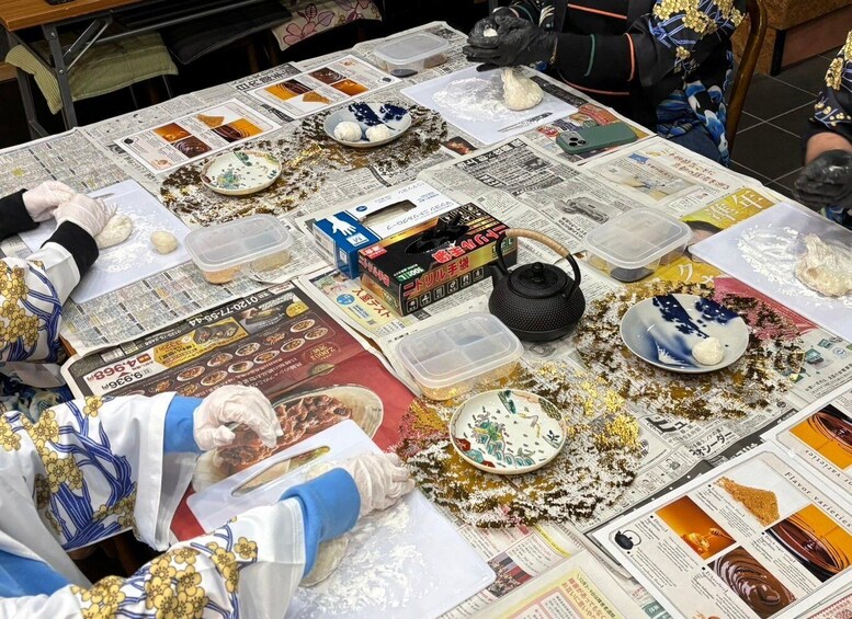 You can then enjoy the mochi you’ve pounded by dipping it in one of four toppings: kinako (roasted soya bean flour), chocolate, honey, or black sugar syrup.