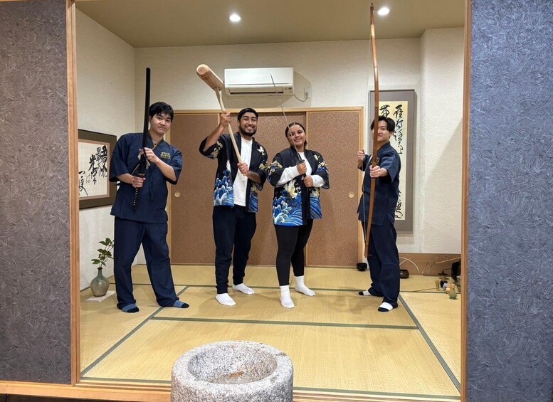 Finally, our staff will take a free family photo of you holding the mochi-pounding tools and the katana.