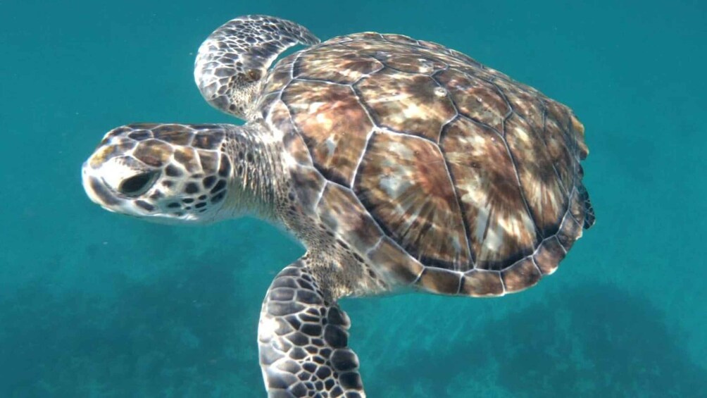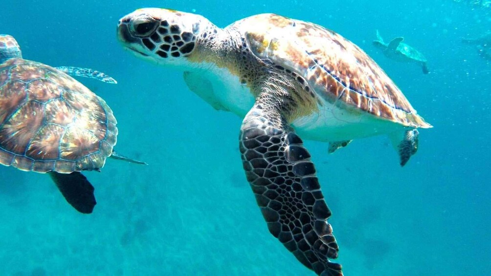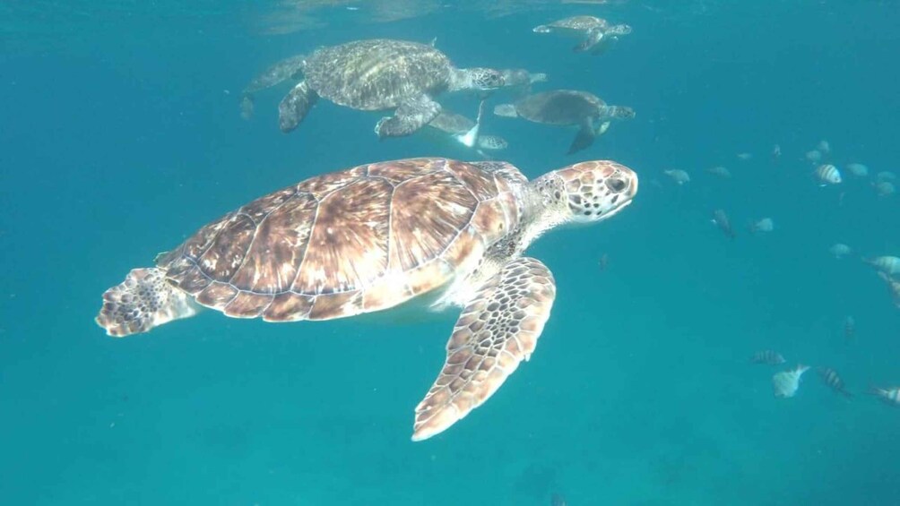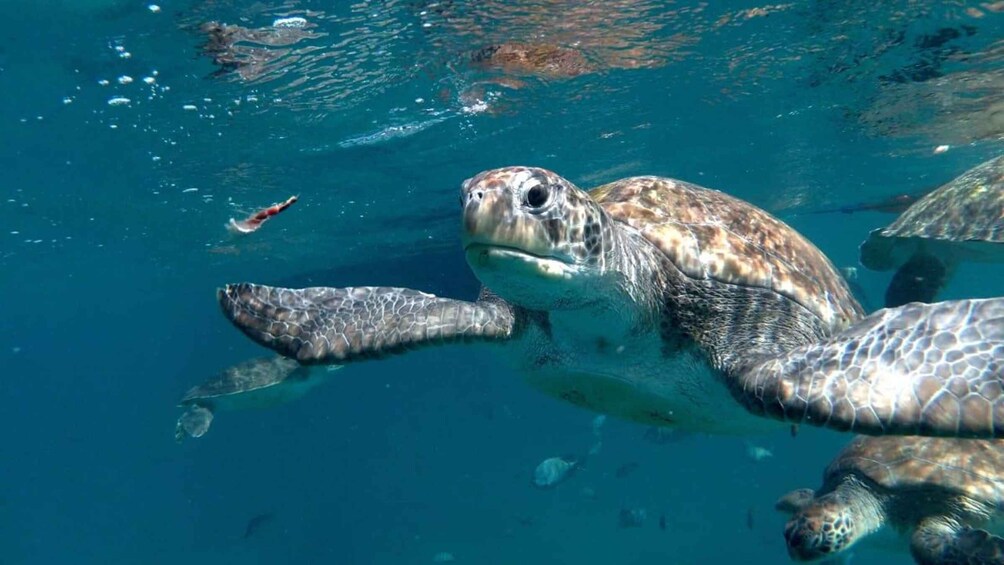 Then, with your guide, you'll enter the bay's crystal-clear waters, where the magic begins: you'll have the unique chance to swim side by side with sea turtles in their natural habitat. These majestic creatures are peaceful and curious, providing a thrilling and unforgettable experience.