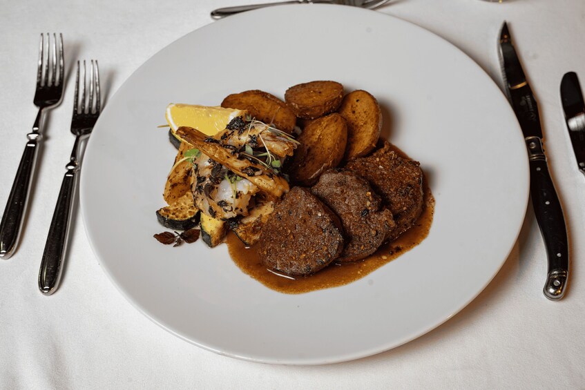 • Surf & Turf from the beef hip with Black Tiger shrimp and seasonal vegetables or creamy risotto with fresh vegetables. (vegetarian option)