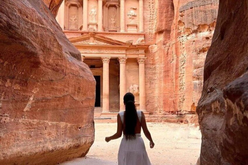 Begin your journey with a drive south to the breathtaking city of Petra, one of the New Seven Wonders of the World. Carved into rose-red rock by the Nabataeans over 2,000 years ago, Petra is a masterpiece of ancient engineering and natural beauty. Walk through the narrow Siq canyon to reach the iconic Treasury, then explore its remarkable tombs, temples, and hidden pathways.
