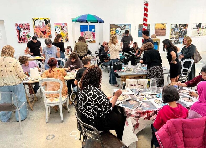 Art supplies (canvases, brushes, paints) are provided in the studio