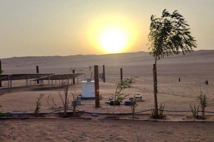 Experience the golden dunes of Wahiba Sands Desert with sunset views