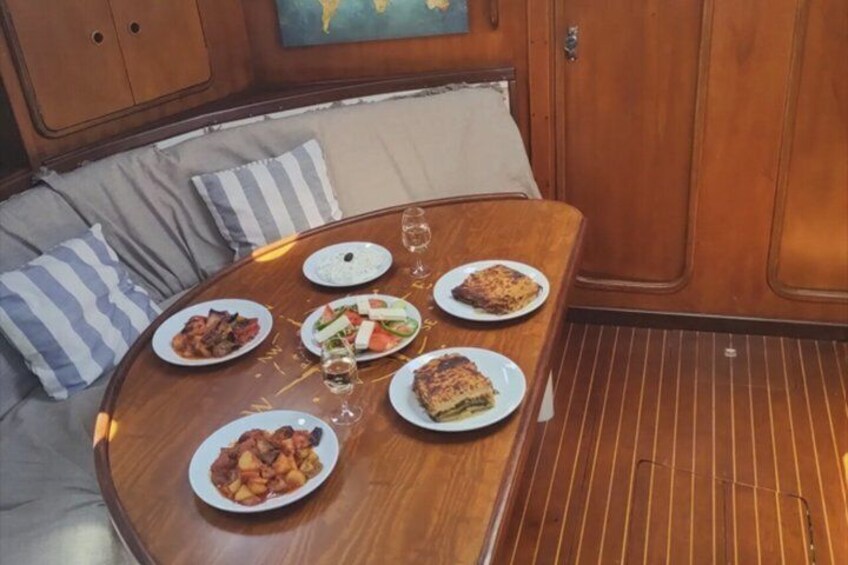 A highlight of the cruise is the iconic Kleftiko, with its imposing white rocks and crystal-clear waters. Here, moments of swimming are offered, as well as a carefully prepared onboard meal, with views of the endless blue of the Aegean Sea.