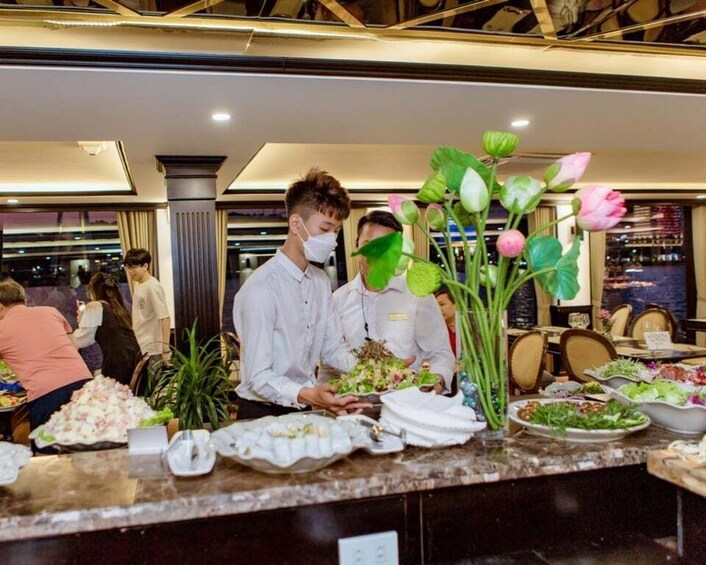With the grand drum performance by the enthusiastic crew, the Sea Octopus sets sail from the port of the Halong International Passenger Terminal, welcoming guests with a refreshing drink, a video introduction to the cruiser, as well as important safety and environmental information.