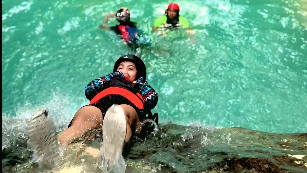 Our professional canyoneering guides will assist you with your safety gear including helmet, life jacket, and canyoning shoes. After a short safety briefing, you may walk to the first jump or take the optional zipline for an added thrill.