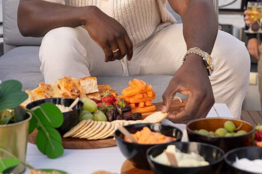 Snacks and nibbles: A tasty and fresh grazing platter to nibble on + 1 complimentary drink per person.