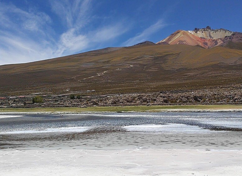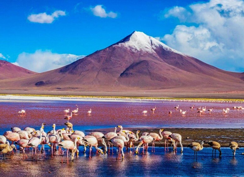 Day 1: We will pick you up at your hotel and leave by minibus from San Pedro de Atacama to the border with Bolivia, passing through the border offices of Chile and Bolivia. Once at the border, we will change vehicles to a 4x4 for 6 people. On this first day we will visit places in the Bolivian Altiplano, such as Laguna Blanca and Laguna Verde, located at the foot of the LicaCabur volcano. We will continue visiting the Salvador Dalí desert, the Pulido hot springs, with time for a bath, and the Sol de Mañana Geysers, intermittent water sources that spring up at a temperature of 90ºC. We will end the day at La Laguna Colorada, nesting centre for more than 30,000 flamingos. Tonight we will stay at the Villamar refuge. Day 2: After breakfast, we will take the route to Tomás Lakha, where you can see pre-Incan cave paintings. Afterwards, we will visit Lost Italy, where volcanic rock took the form of what seems to be an abandoned city. Afterwards, we will go to Laguna de Vinto and Laguna de Catal, where you can walk and see the typical fauna of the Bolivian highlands. Later, we will visit the Anaconda Canyon and also the Sora Canyon, before continuing through the Salar de Chiguana and arriving at Colcha K, where you will spend the second night of accommodation. Day 3: Very early in the morning, we will begin our last day of excursion with the view of the sunrise at the Salar de Uyuni. After this experience, we will move to Incahuasi Island, a limestone rock formation located in the centre of the salt flat that we will be able to walk around and have another perspective of the salt flat. We will continue towards the salt museum and the town of Colchani, now without salt. From here we will move to Uyuni, through the Train Cemetery, where we will make a short stop to take photos. In Uyuni, we will say goodbye to our driver-guide, who has accompanied us for the previous three days, and then we will have some free time to have lunch and tour part of the city. Afterwards, we will meet the driver who will take us back, stopping in Villamar for dinner and rest. Day 4: We will get up very early to continue our return trip and reach the border of Chile and Bolivia. Once here, and after the corresponding formalities, we will change vehicles to a minibus to return to San Pedro de Atacama.