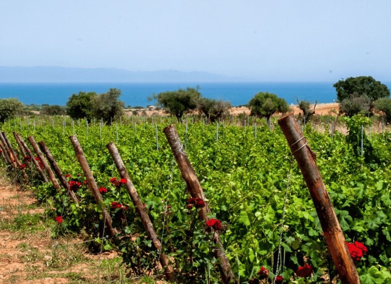 Then, step outside and walk through vineyards that stretch across 21 hectares of coastal hillsides. Gently caressed by marine breezes and bathed in Mediterranean sunlight, the vines grow in a mosaic of sandy and clay soils enriched by granitic particles from the surrounding Capoterra mountains. This terroir — unique even within Sardinia — gives the wines their freshness, structure, and aromatic complexity.